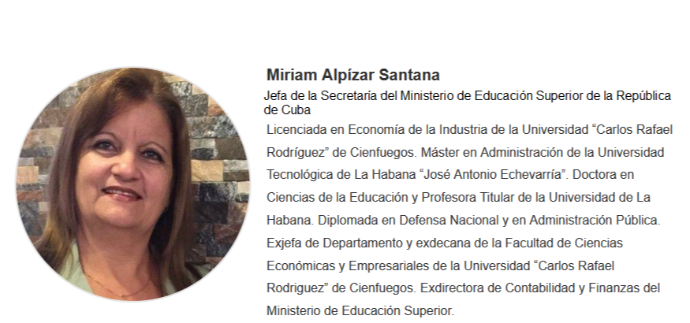 Dr. C. Miriam Alpizar. Santana Jefa de la Secretaria del ministro, del Ministerio de Educación Superior (MES) y Presidenta del Comité de Género del MES. Cuba.