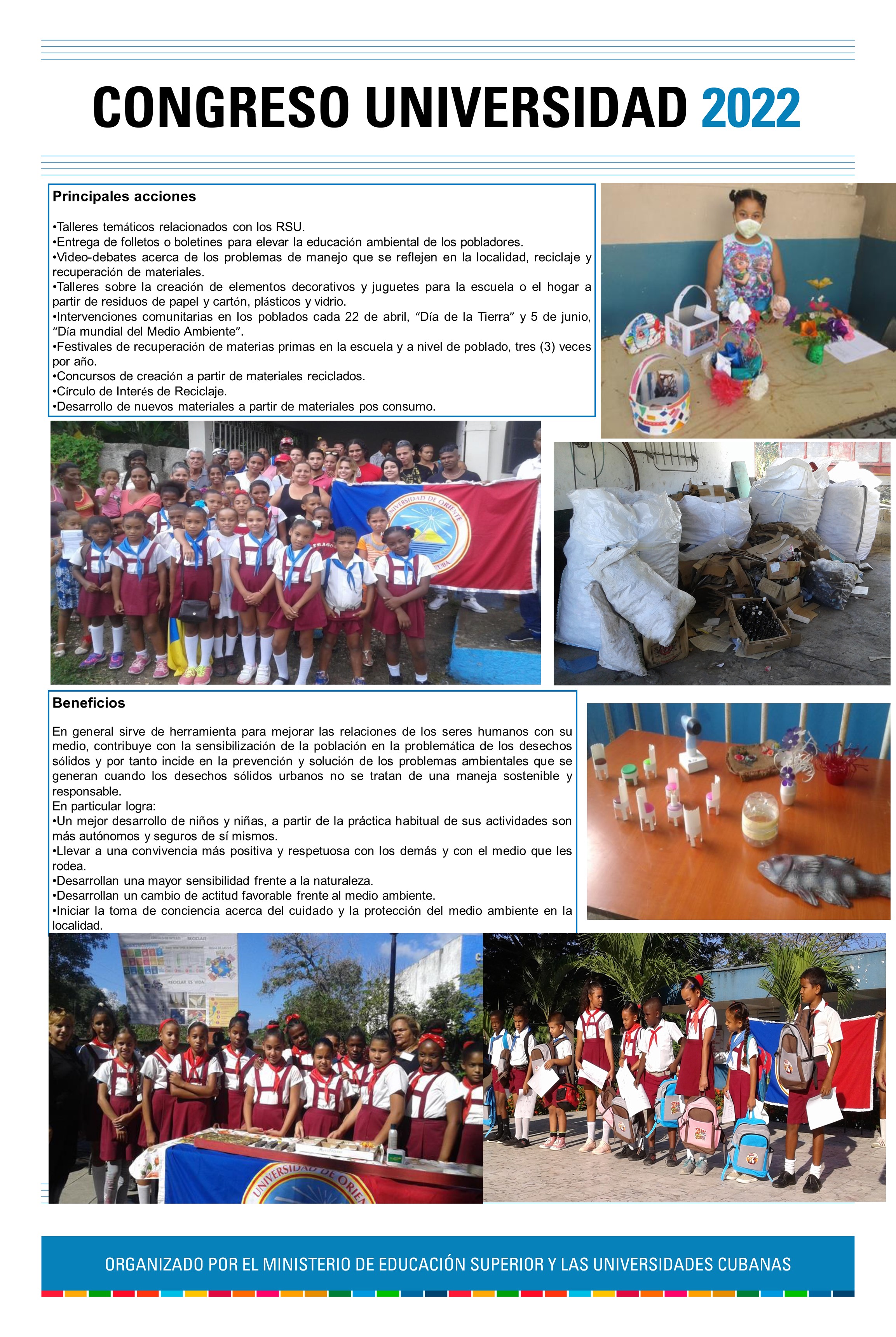 The community project: Garbage, throw away or reuse? is an integration of extracurricular activities at the Rubén Bravo Álvarez primary school in its community in the town of "El Cobre". It also has the participation and collaboration of the different organisms of the territory that in one way or another are related to the management, use and destination of urban solid waste, including the Universidad de Oriente and the Raw Materials Recovery Company. Its objective is to disseminate and share knowledge about the different environmental problems caused by the generation of wastes to contribute to the development and implementation of methods to reduce its generation and increase its reuse through recycling or recovery of materials. The Faculty of Mechanical and Industrial Engineering, in its extension work, has achieved excellent results in working with children through the materialization of this project. After four years, garbage, throw